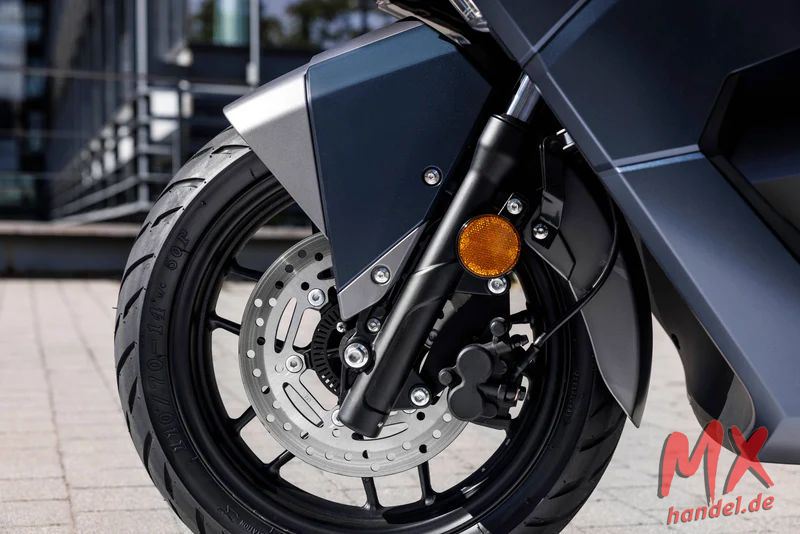 - Sie ist mit ABS-Bremsen ausgestattet, die als die effektivste Bremstechnologie gelten. Sie regulieren den Bremsdruck an jedem Rad, um den Bremsweg zu verkürzen. Zusammen mit einem breiten 120/70-15-Vorderreifen und einem 140/70-14-Hinterreifen sorgen sie für maximale Haftung und Fahrkomfort im Stadtverkehr.