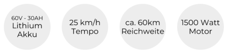 Der leistungsstarke 1500-Watt-Motor sorgt für kraftvolles und zügiges Vorankommen. Der herausnehmbare 60V-30Ah Lithium-Akku ermöglicht eine Reichweite von rund 65 Kilometern – ideal für alltägliche Erledigungen, Arztbesuche oder kleine Touren ins Grüne. Dank der automatischen Schaltung ist das Fahrzeug besonders intuitiv zu bedienen – auch ohne Vorkenntnisse. Die drei wählbaren Geschwindigkeitsstufen ermöglichen die konstante Einhaltung auch niedrigerer Geschwindigkeiten. Zusätzlich verfügt das Fahrzeug über einen Rückwärtsgang, was das Manövrieren erheblich erleichtert.