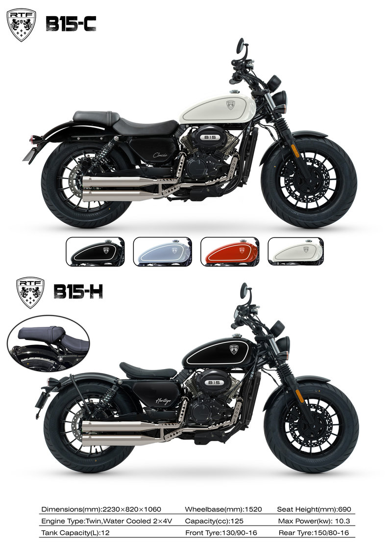 Die neue B15 wurde grundlegend überarbeitet und ist nun mit einem 124-ccm-Motor ausgestattet. Dieser leistungsstarke, wassergekühlte V2-Motor mit 10,3 kW / 14 PS garantiert herausragende Leistung. Zu den technischen Highlights zählen außerdem Dual-ABS, eine Kette, eine einfache Bremsscheibe vorne, eine Alu-Schwinge, LED-Beleuchtung sowie ein doppelter Edelstahlauspuff. Der bekannte, lange Radstand (1520 mm) sowie die markante Bereifung (vorn: 130/90-16, hinten: 150/80-16) und das unverwechselbare Design, das bereits im letzten Jahr viele Kunden begeistern konnte, bleiben selbstverständlich erhalten.